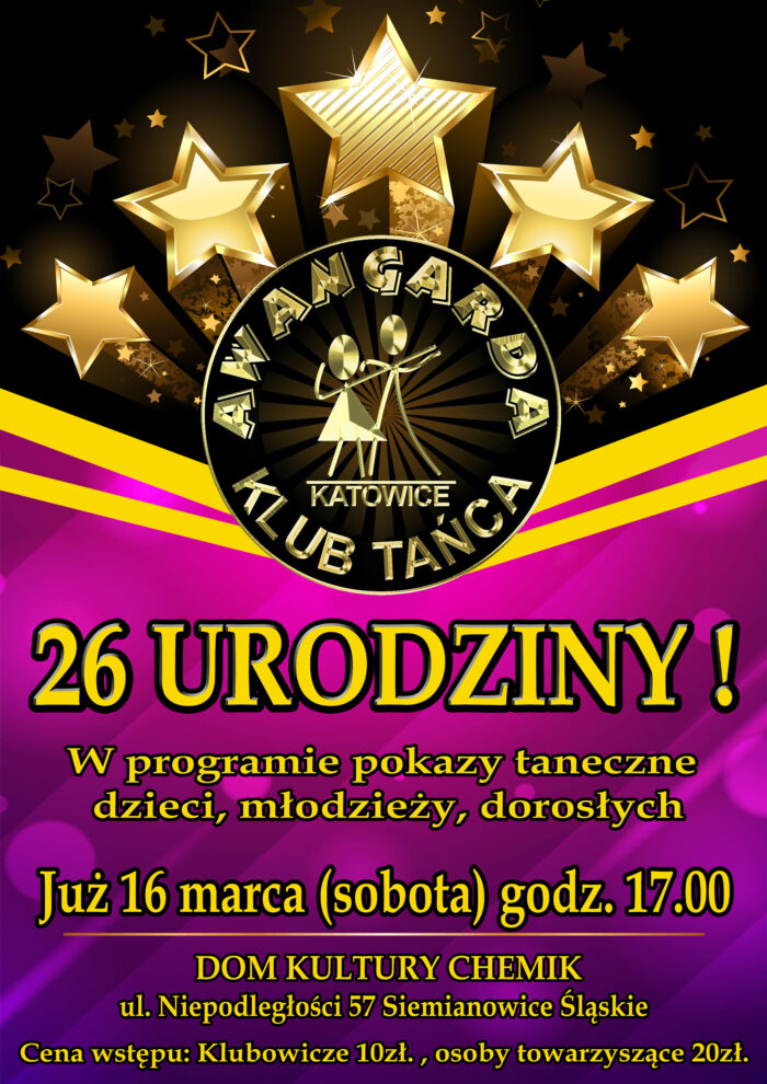 26 URODZINY Klubu Tańca AWANGARDA Katowice Dnia 16 marca 2019 (sobota) od godz. 17.00 obchodziliśmy 26 LECIE AWANGARDY KATOWICE, które odbywało się w DOMU KULTURY ” CHEMIK ” ul. Niepodległości 57, 41-106 Siemianowice Śląskie